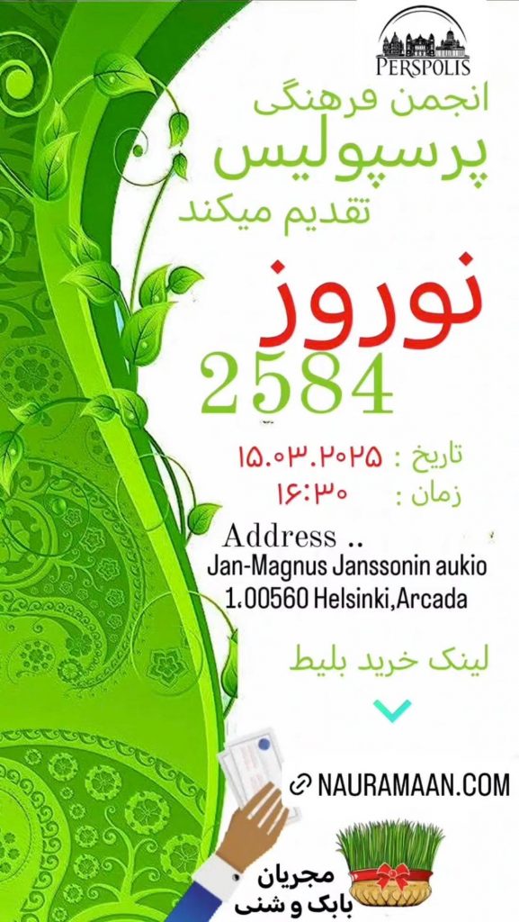 Perinteinen iranilaisten uuden vuoden juhlat järjestetään maaliskuun 15 päivä Helsingissä. Tervetuloa mukaan.